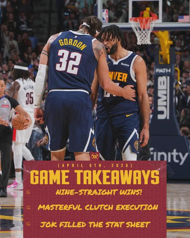 北京时间4月7日,NBA常规赛,掘金加时137-132力克开拓者,掘金豪取9连胜。此役过后,掘金51胜28负升至西部第三,湖人50胜28负跌至西部第四。明天湖人打雷霆,如果湖人获胜将夺回西部第三,否则的话只能在第四待着了。