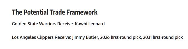 也正是这种处境上的差异,让勇士追逐伦纳德的想法,比两个月前更加迫切,也更加有意义。蒂姆·川上透露,勇士管理层已经明确表态,休赛期将继续积极出击,目标就是围绕库里,打造最后一次真正有竞争力的冲冠阵容,而伦纳德,就是他们眼中唯一能真正改变球队上限的超级巨星。经过多方梳理,目前流传最广的交易框架已经浮出水面,堪称一场大胆的3换1豪赌:勇士送出吉米·巴特勒、2026年首轮选秀权和2031年首轮选秀权,从快船手中得到卡怀·伦纳德。