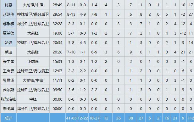 本场辽宁男篮球员数据,赵继伟27分6板8助2断、莱迪21分9板、付豪17分7板1助、哈维14分1板3助、莫兰德11分7板2助、威尔斯9分、王岚嵚6分、鄢手骐4分7助。