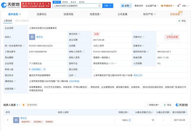 天眼查工商信息显示,上海烁光体育文化发展事务所成立于2017年4月,出资额10万人民币,经营范围含体育赛事策划、文化艺术交流策划、体育咨询等,为郭艾伦个人独资企业。目前该事务所已注销。