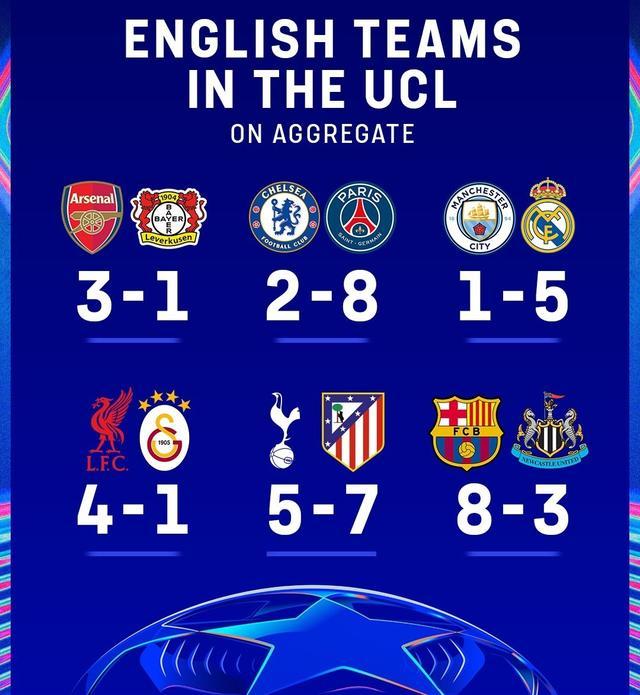 出局的4支球队中,有3队遭遇了两回合双杀惨败,曼城1-5皇马、切尔西2-8巴黎、纽卡3-8巴萨,16强出炉时的英超王朝势头已戛然而止!