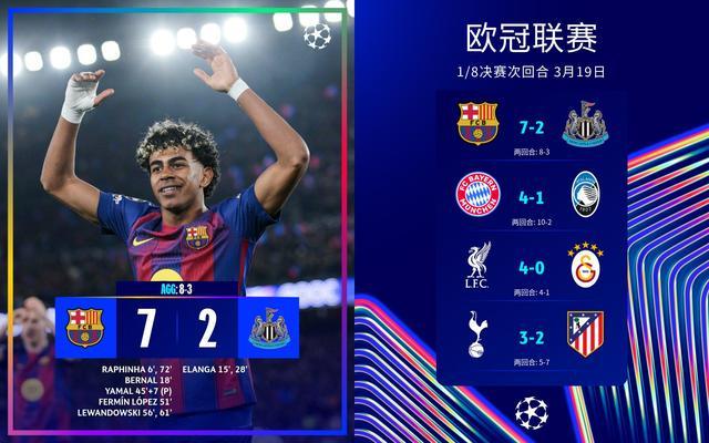 全场比赛结束,巴萨主场7-2狂胜纽卡踢出大比分惨案,两回合总比分8-3挺进本赛季欧冠8强,拉菲尼亚2球2助当选本场MVP!