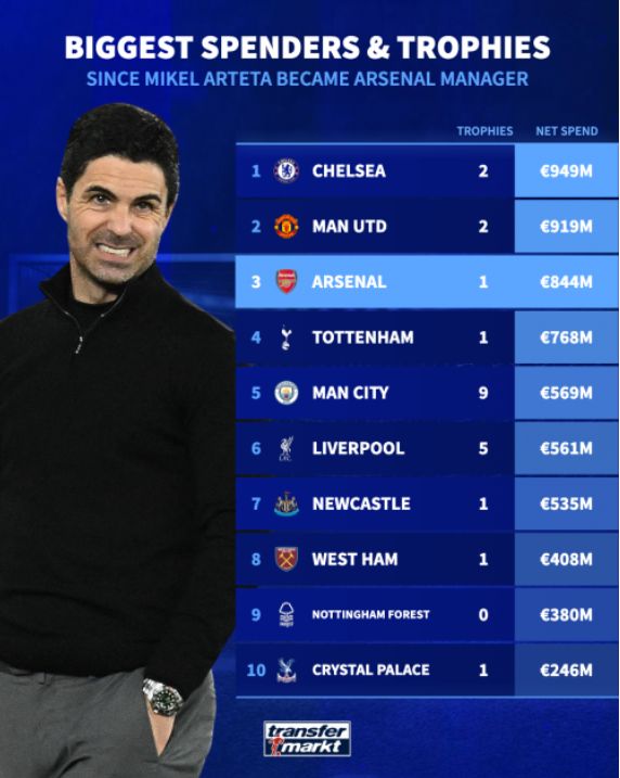 从2020年1月到现在花了近10亿欧元买人,阿尔特塔手里只有一个冠军(2019/20赛季足总杯)。这不仅落后于切尔西和曼联,跟利物浦(5个)和曼城(9个)更是没法比。