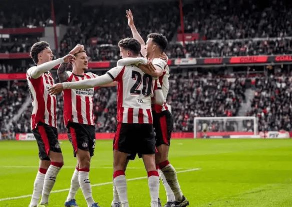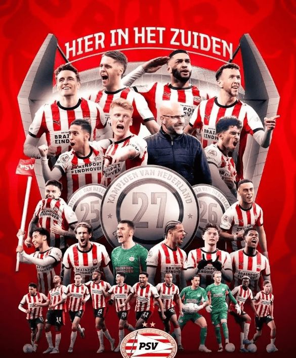 这下,埃因霍温在还剩5轮的情况下领先第二名17分,数学上已无任何翻盘可能。于是,他们提前加冕,实现荷甲三连冠,队史第27次捧起联赛金杯!