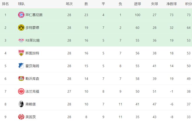 在积分榜上,拜仁遥遥领先。拜仁23胜4平1负,拿到73分,排名榜首。而多特蒙德只拿到64分,排名第2,落后了9分,争冠希望渺茫。莱比锡以53分排名第3。第4的斯图加特也是53分。霍芬海姆以50分排名第5。第6名的是勒沃库森,只拿到49分,想要争夺欧冠资格难度不小。法兰克福以38分排名第7。